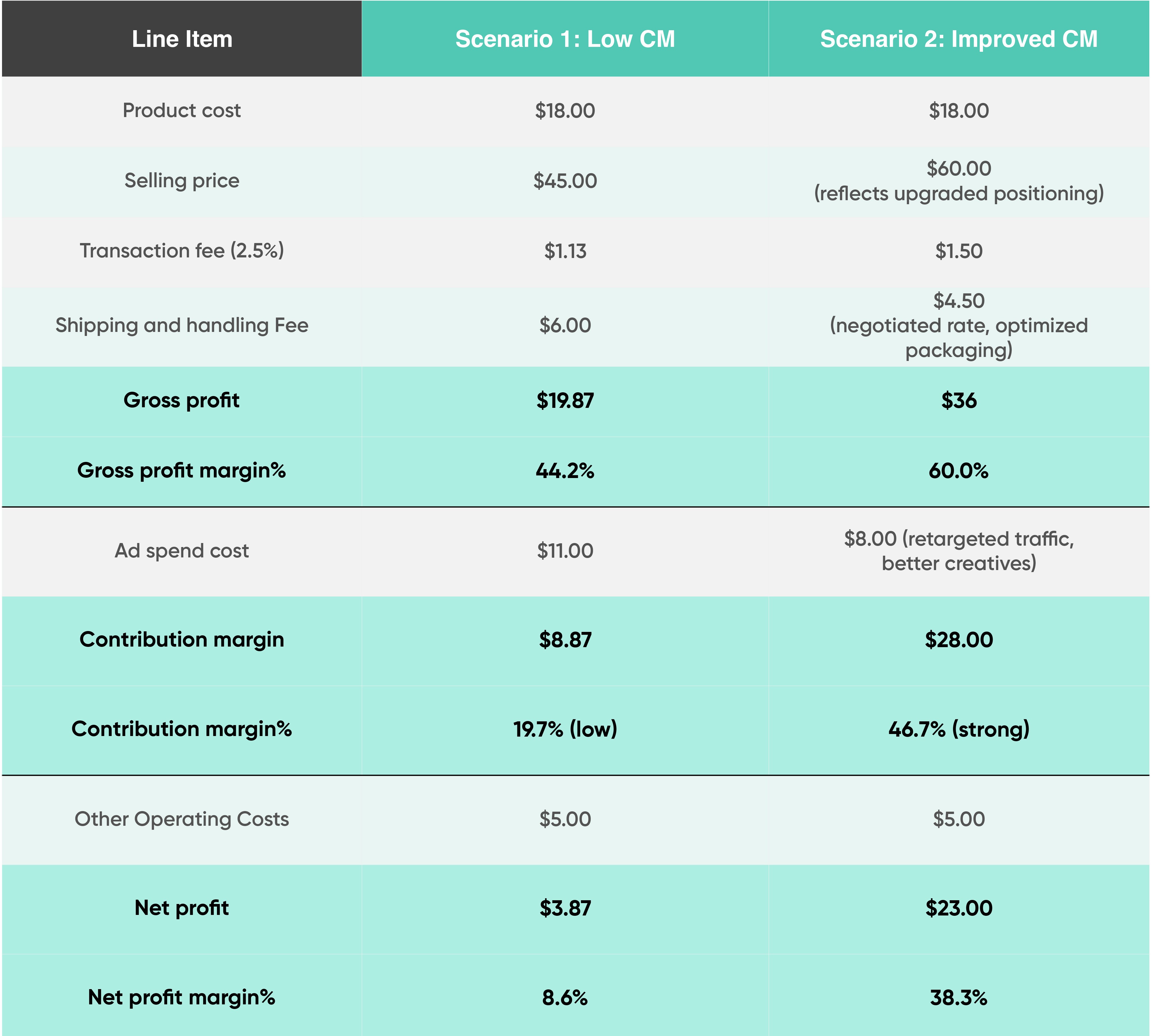 If you are analyzing profits only based on gross profit, the product seems profitable and scalable, as you are earning nearly $20 per sale (scenario 1). But that illusion fades fast once you factor in ad costs, exposing just how weak the contribution margin really is.